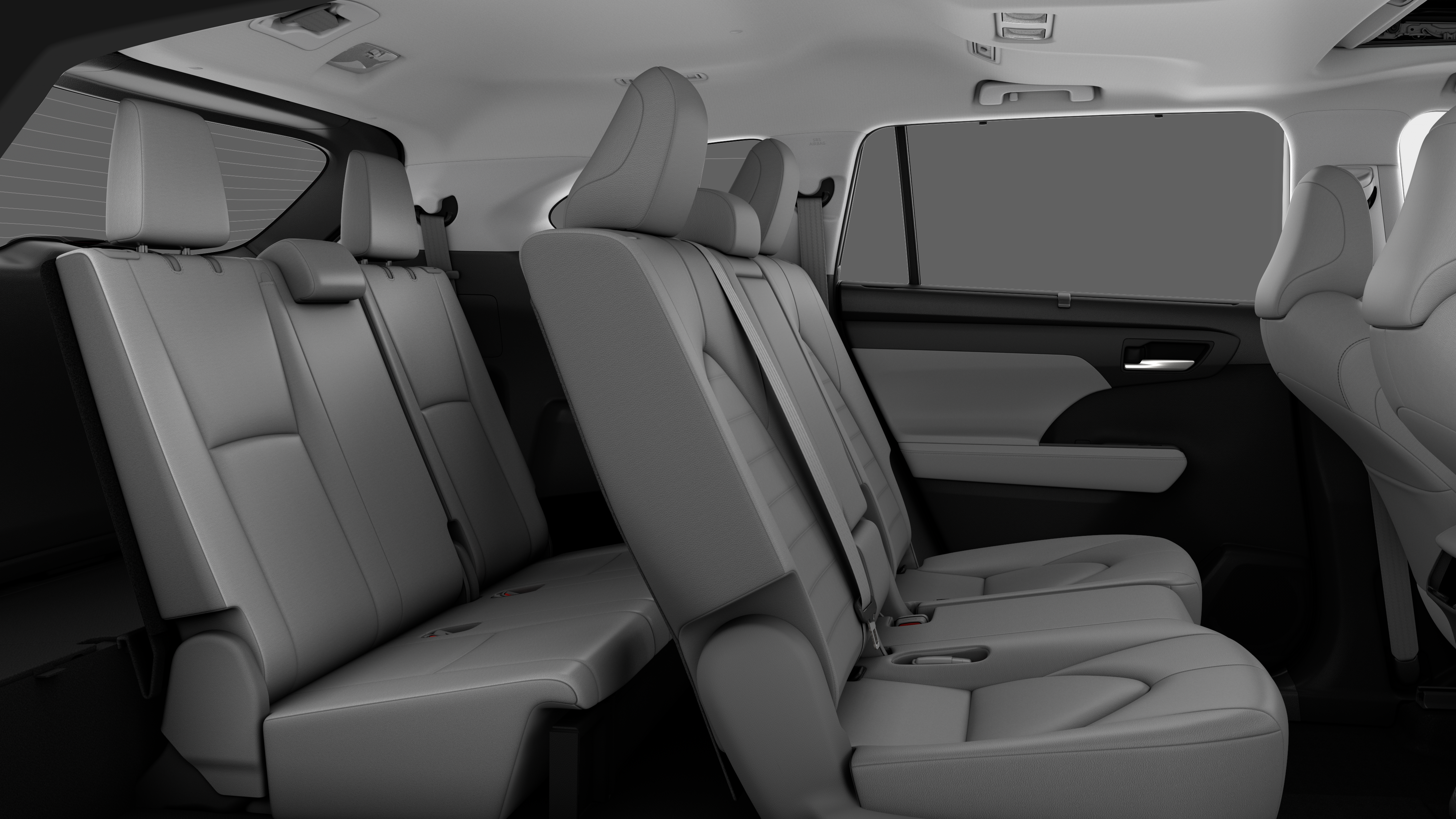 - 7-passenger seating with second-row fold-down captain's chairs and fold-down inboard armrests, adjustable headrests and two cup holders mounted on the floor; and 60/40 split, fold-flat third-row seats with sliding headrests and recline function