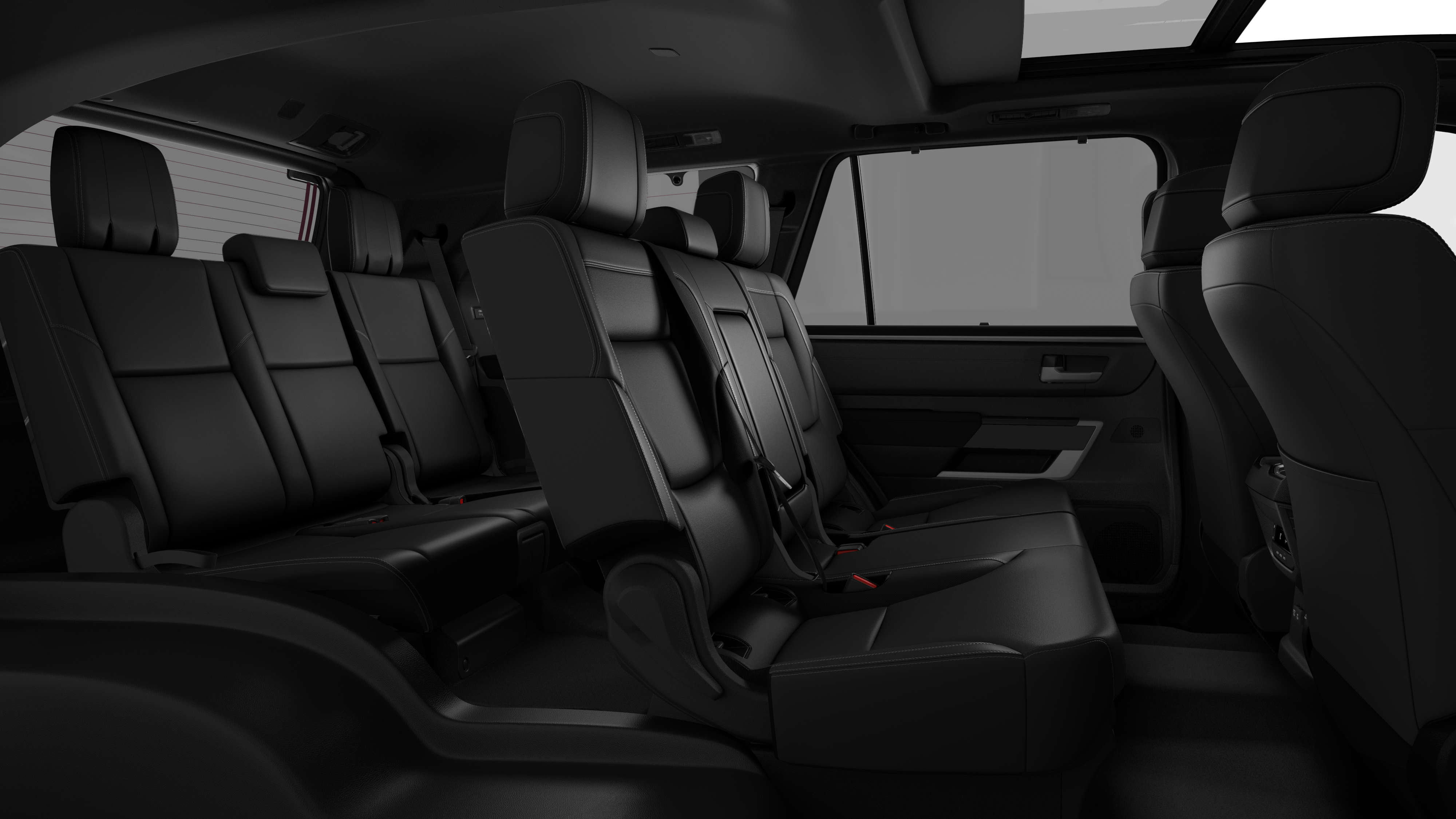 - Leather-trimmed 60/40 split, sliding, power-reclining, power fold-down third-row seats with adjustable headrests